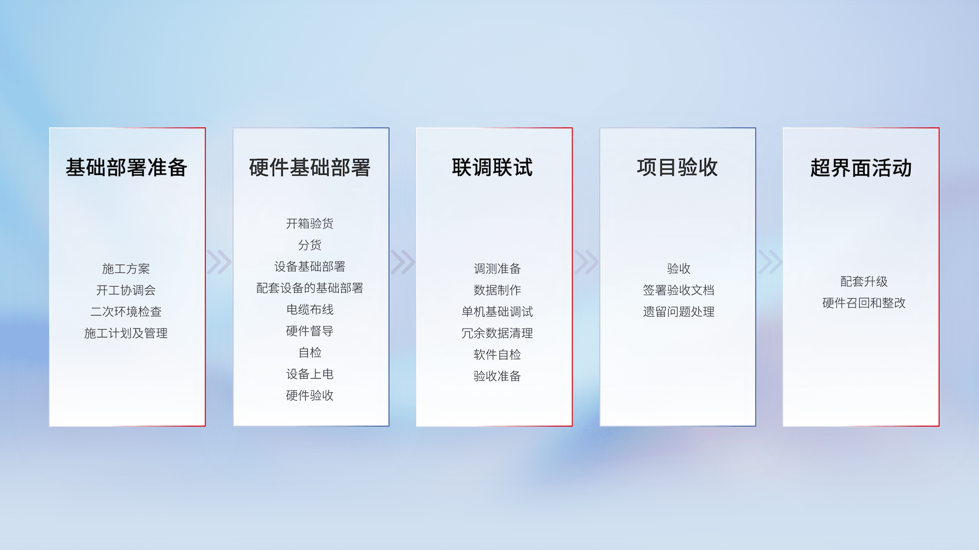 从基础部署准备、、硬件基础部署、、、联调联试、、、、项目验收、、、越界面活动的全过程可追溯,,,,保证施工质量和进度。。。